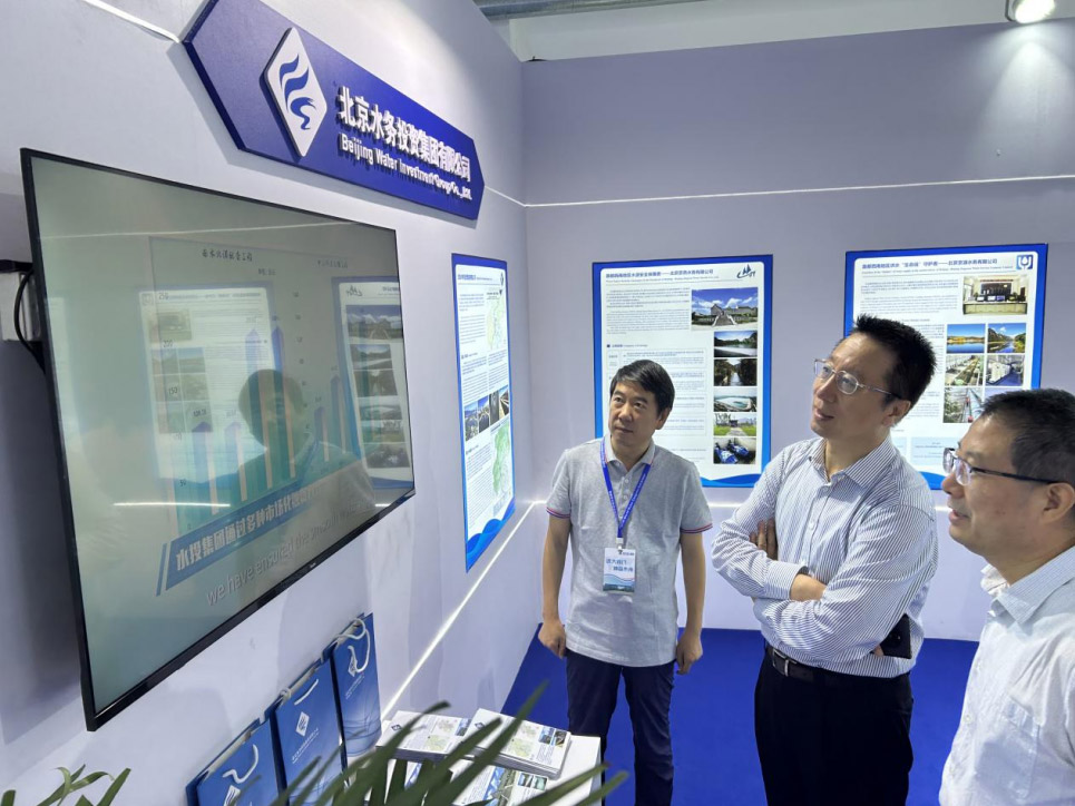 9月13日,水利部总规划师吴文庆参观北京水务展台,市水务局总规划师刘洪伟陪同介绍
