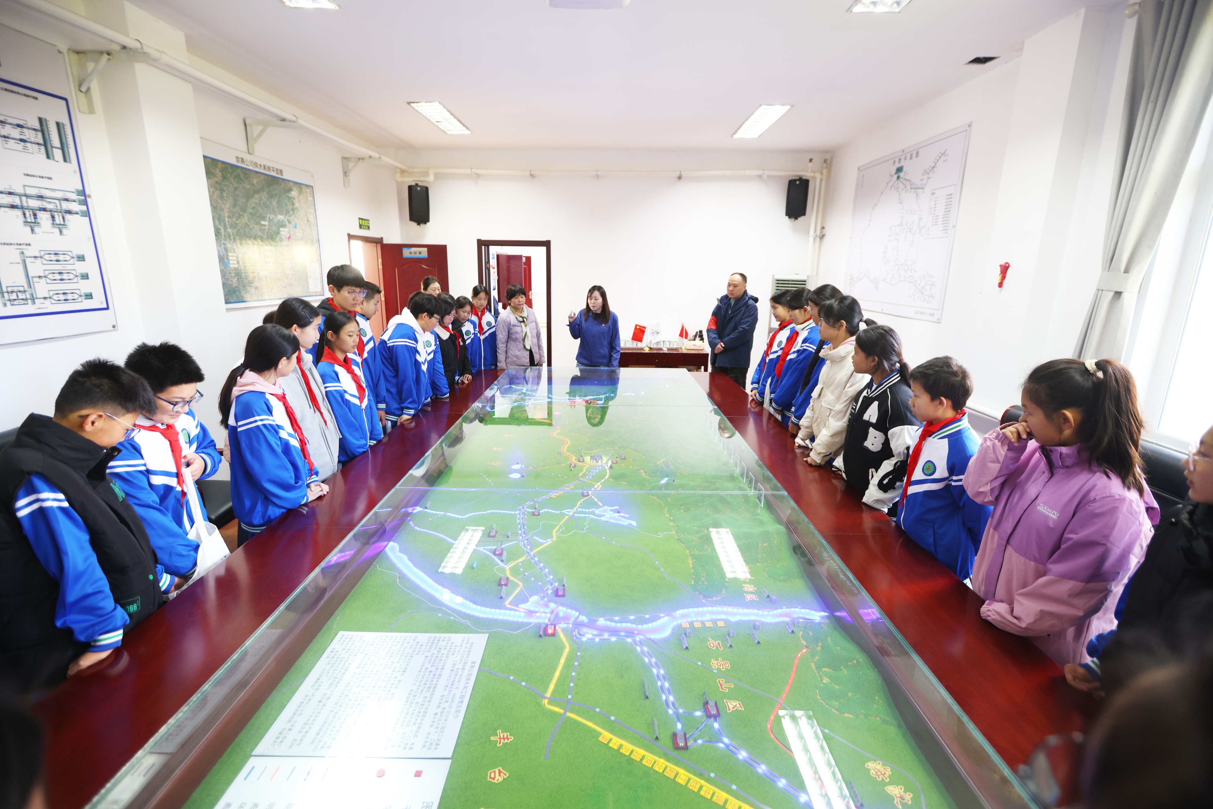 京燕公司在保留经典线路的基础上,重点突出了企业展示环节——下寺管理所的宣传展板前,接待人员详解“23・7”等特殊时期的抢险历程,一个个鲜活案例与关键数据,让大家深刻感受到企业守护供水安全的坚定决心。在生产调度部的全线供水系统沙盘前,灯光亮起的瞬间,西线供水网络清晰可见:从胜天渠五渡取水口到下寺管理所三渡泵站,从沉砂调蓄池到管网输送,每一个节点都标注着“24小时值守”的字样。这800米沉砂调蓄池一圈走下来,才懂得“每滴水都要过五关斩六将”。