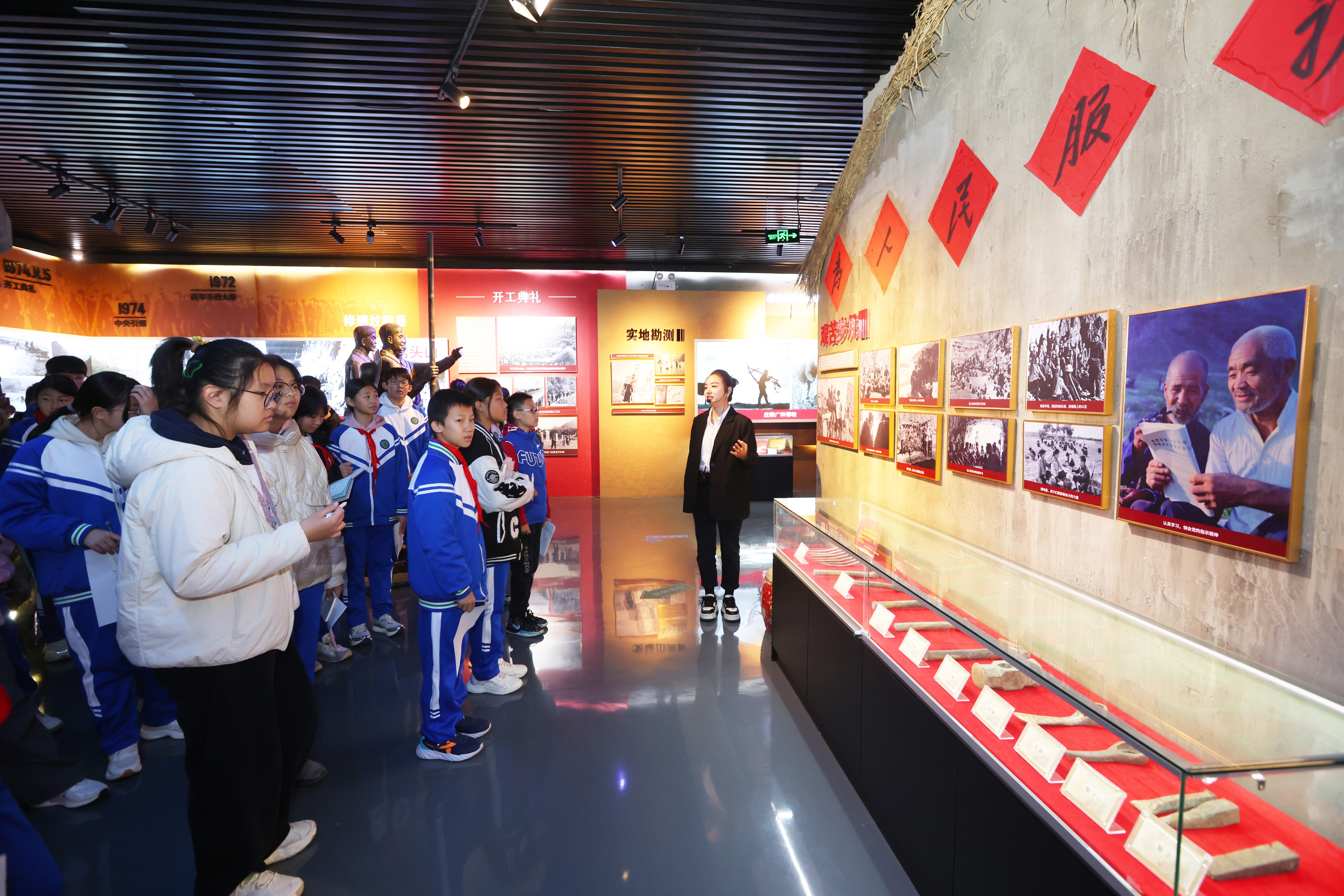 9时5分,前往活动第二站——胜天渠纪念馆。走进纪念馆,大家仿佛穿越时空,回到了开山修渠的峥嵘岁月。在讲解员的带领下,通过声光电多媒体技术、实物造景与历史档案相结合,再现了20世纪70年代张坊人民战天斗地的水利奇迹,进一步加深了对这段光辉历史的了解,深刻体会到“信念坚定、团结协作、艰苦拼搏、造福百姓”的精神。